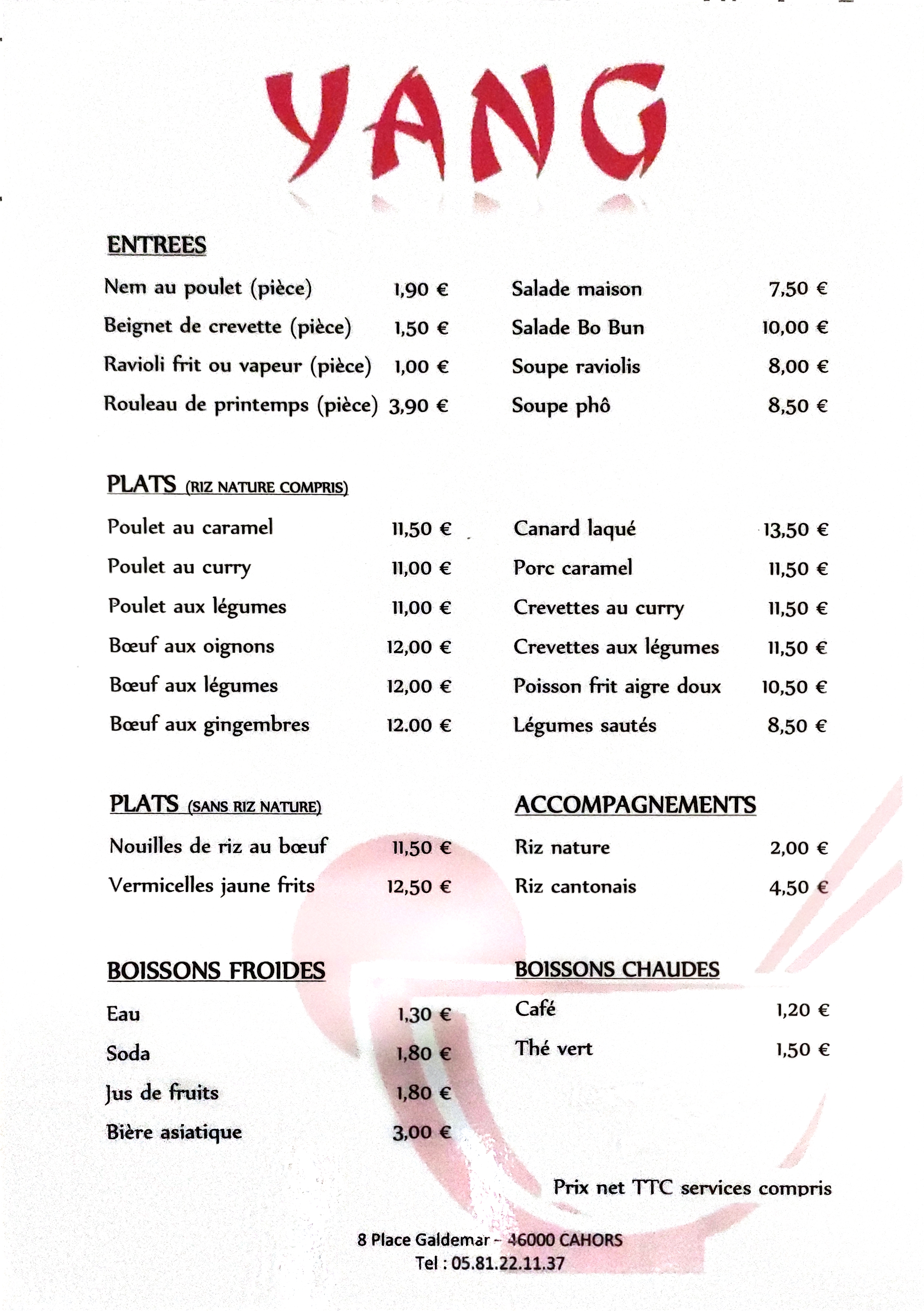 Pour les connaisseurs, vous retrouverez la même cuisine que celle du restaurant le Soleil Ho, situé 36 rue Mordaigne à Cahors, géré par nos parents Martine et Joseph depuis 30 ans. Suite à sa fermeture, nombreux d'entres-vous nous ont sollicité et encouragé pour ré-ouvrir le restaurant. Chose faite mais sous une tout autre enseigne "YANG". ET NOUS VOUS EN REMERCIONS !